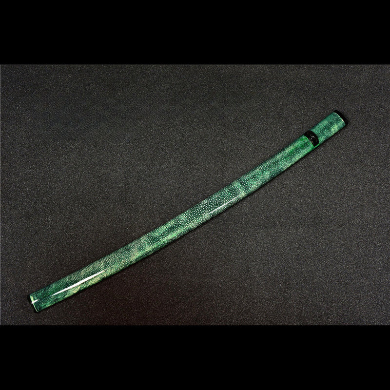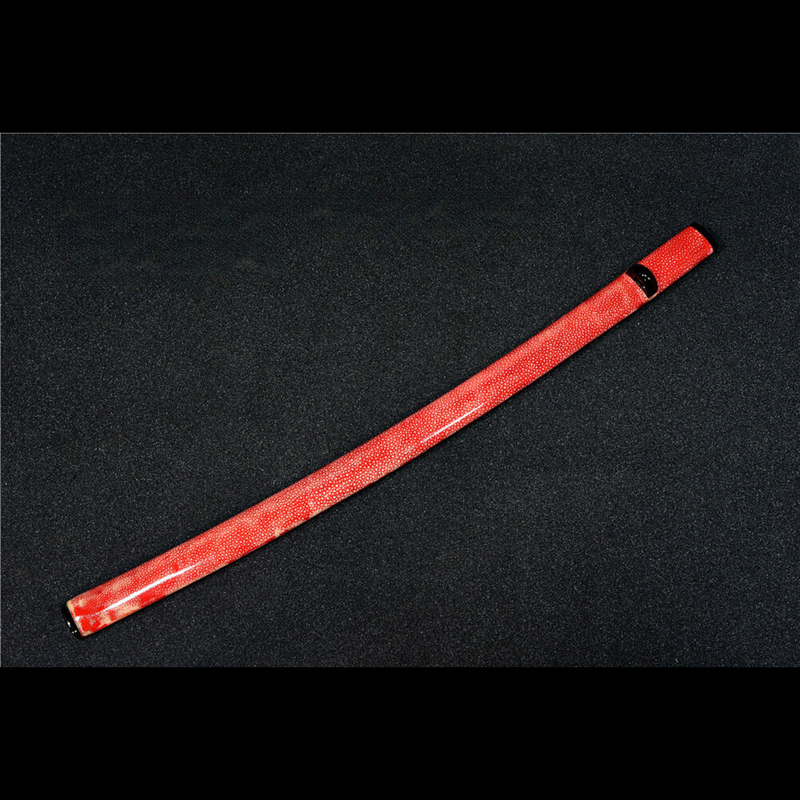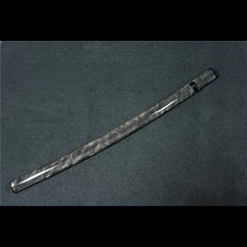 This is an exquisite samurai sword saya fully wrapped in ray skin, meticulously polished to a smooth and refined finish. The kurigata, kojiri, and koi-guchi are all crafted from horn, enhancing both the durability and the aesthetic appeal of the saya. The saya is 76 cm in length, making it suitable for a 26-inch samurai sword. The texture of the ray skin not only adds a premium tactile feel and durability, but also infuses this saya with a blend of traditional craftsmanship and functionality. Whether for collection or practical use, this saya embodies the artisan's attention to detail and commitment to high-quality craftsmanship.