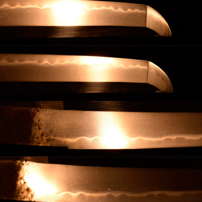 The tightly forged 地鉄 (jigane) is dense and exquisite, and one cannot help but be amazed at the impeccable forging without a single small flaw. The 刃文 (hamon) is a bright gunome-midare, with rounded yakigashira, and its low height difference gives it an elegant appearance. Fine sunagashi can be seen along the blade's edge, and the 帽子 (boshi) is slightly midare on the front and straight with a slightly round return on the back.