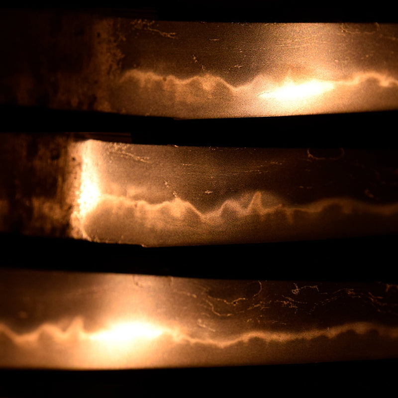 The steel (地鉄, jigane) has a flowing itame grain, well-forged and tight, with beautiful ji-nie. However, it shows some rough patches and large grain. The hamon is a bright and clear gunome-midare, with prominent ashi and ha, showing sunagashi and small irregular patterns. Towards the tip, the hamon becomes finer and more complex, mixing choji and gunome-choji, and the back side of the blade has a hitatsura-like pattern. The boshi is fully tempered with a rounded return.