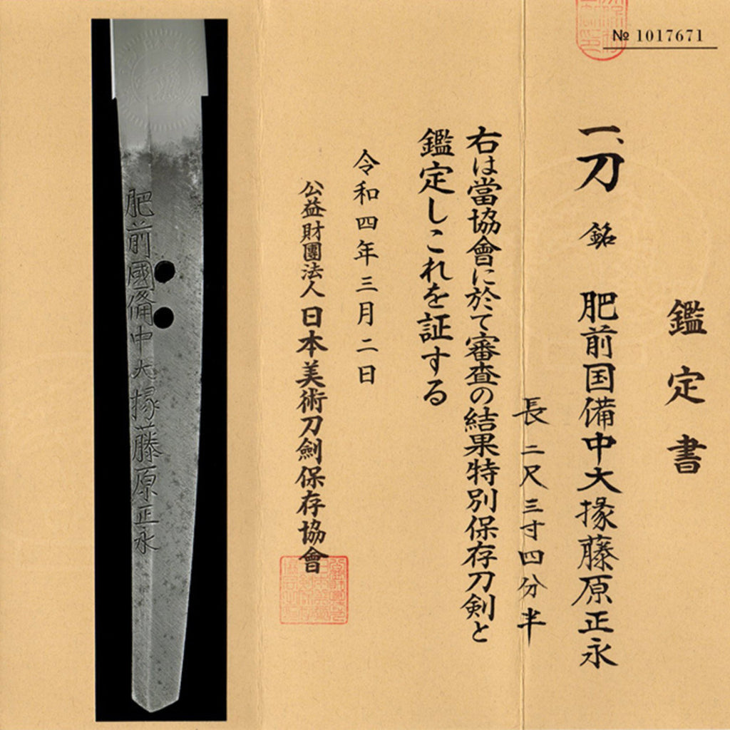 Authentic Nihontō Japanese Sword Katana Signed by Hizen no kuni Bicchu daijo Fujiwara Masanaga 肥前國備中大掾藤原正永 NBTHK TOKUBETSU HOZON TOKEN Certificate/ NTHK 甲種 TOKUBETSU KICHŌ TŌKEN Certificate