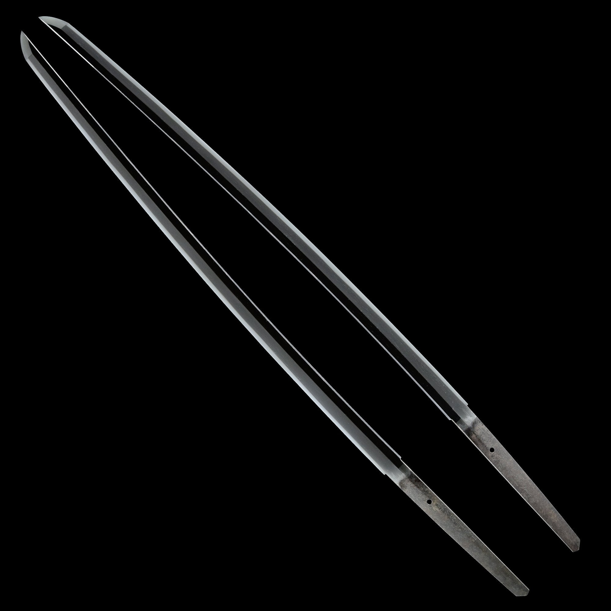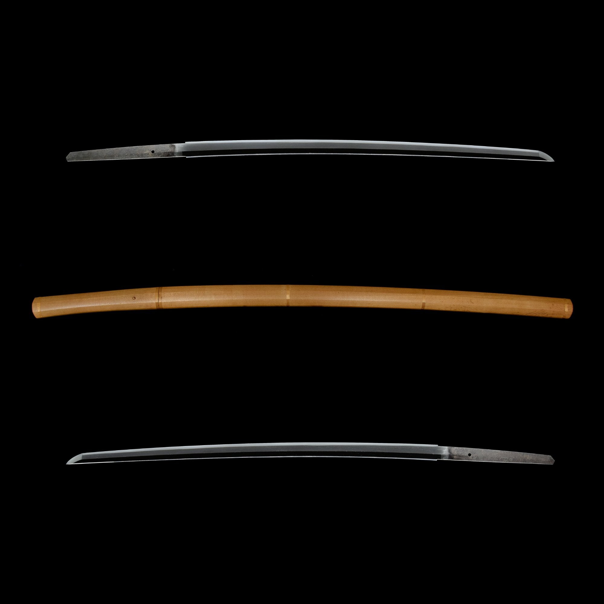 The blade has a shallow curve with a noticeable difference in width between the base and the tip, and a relatively long tang. The center of gravity is near the handle, providing good balance, suggesting a design focused on cutting power in two-handed swordsmanship. The forging pattern consists mainly of straight grain (柾目) with some burl grain (杢), showing fine, well-forged steel. The hamon (刃文) is a middle straight temper line (中直刃調) with slight variations in width, featuring fine sand-like patterns (砂流) within the blade, and intricate activities intertwined with the forging pattern, including both large and small kinsuji (金筋). The boshi (鋩子) is straight with a rounded tip. This is a rare piece not documented in existing records, making it a valuable addition to any collection.