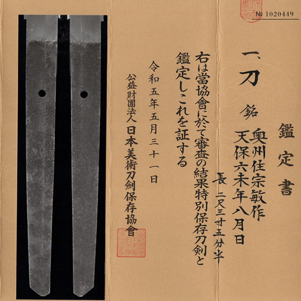 Authentic Nihontō Japanese Sword Katana Signed by Oshu ju Munetoshi  奥州住宗敏作 NBTHK TOKUBETSU HOZON TOKEN Certificate