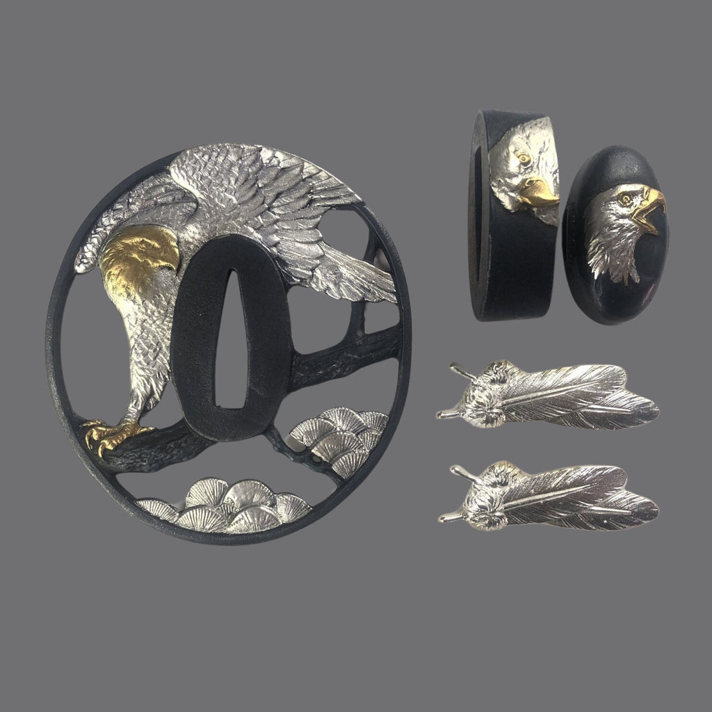 This Tsuba (sword guard) is made from high-quality copper with a blackened finish, giving it a classic and deep appearance. Both sides of the Tsuba depict an eagle with wings spread, intricately detailed with gilding and silver plating to enhance its power and majesty. The eagle’s soaring posture symbolizes freedom, courage, and strength, while the pine tree elements in the design add a natural touch, representing longevity and resilience.