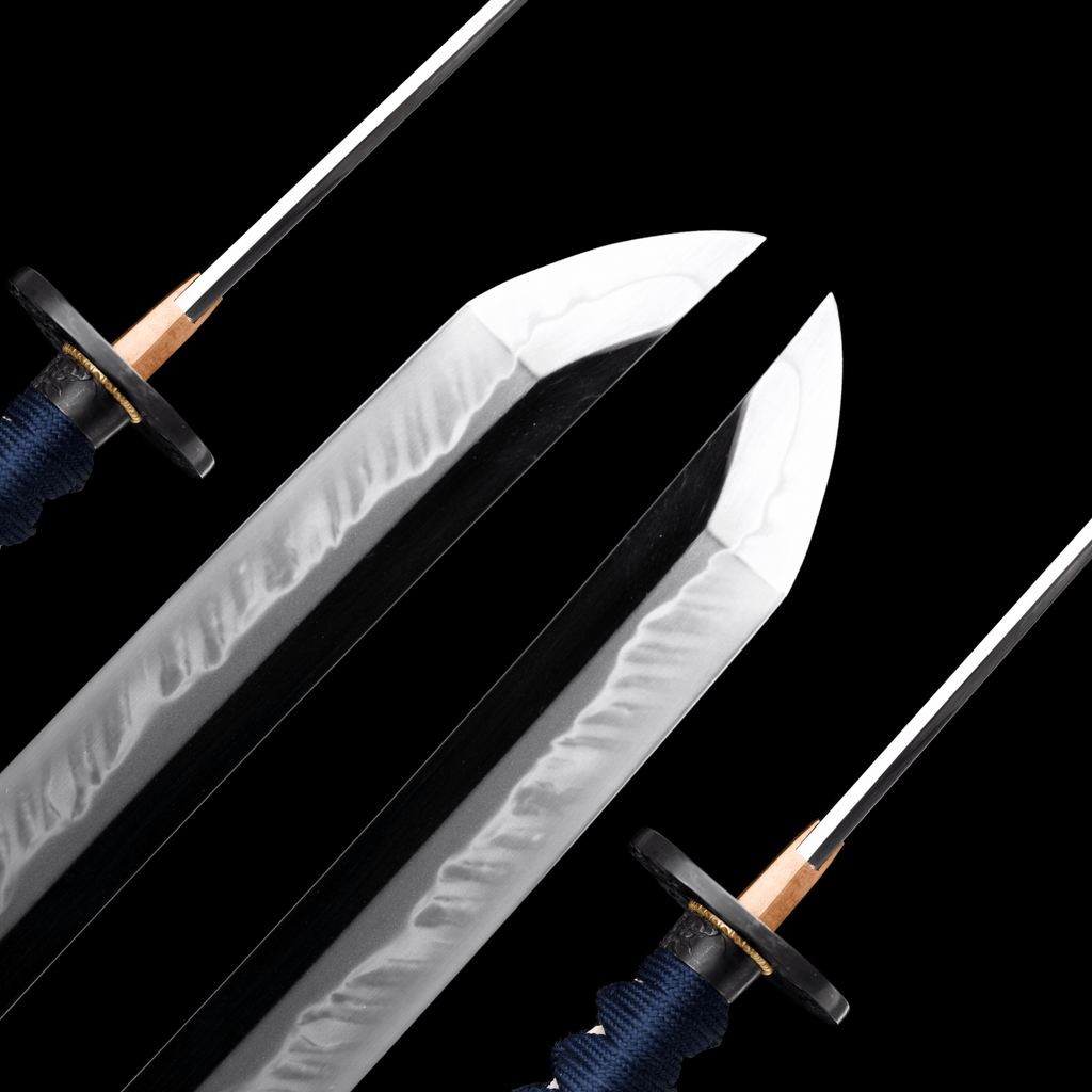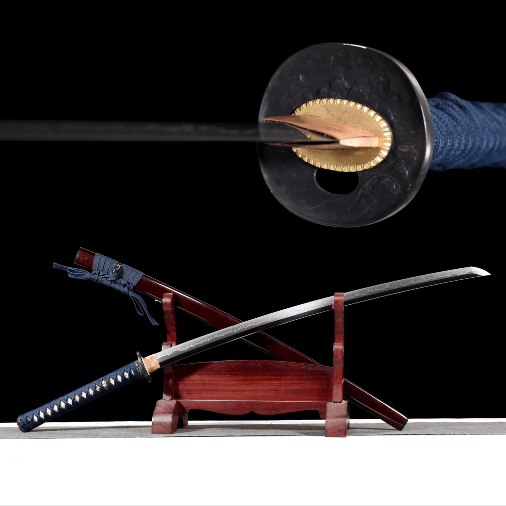 This Azure Lion katana is hand-forged in Maru-zukuri style from high-carbon steel, featuring a distinctive chōji hamon achieved through traditional clay tempering. The blade is shaped in balanced shinogi-zukuri geometry with an elegant iori-mune spine and a medium-sized chū-kissaki tip.