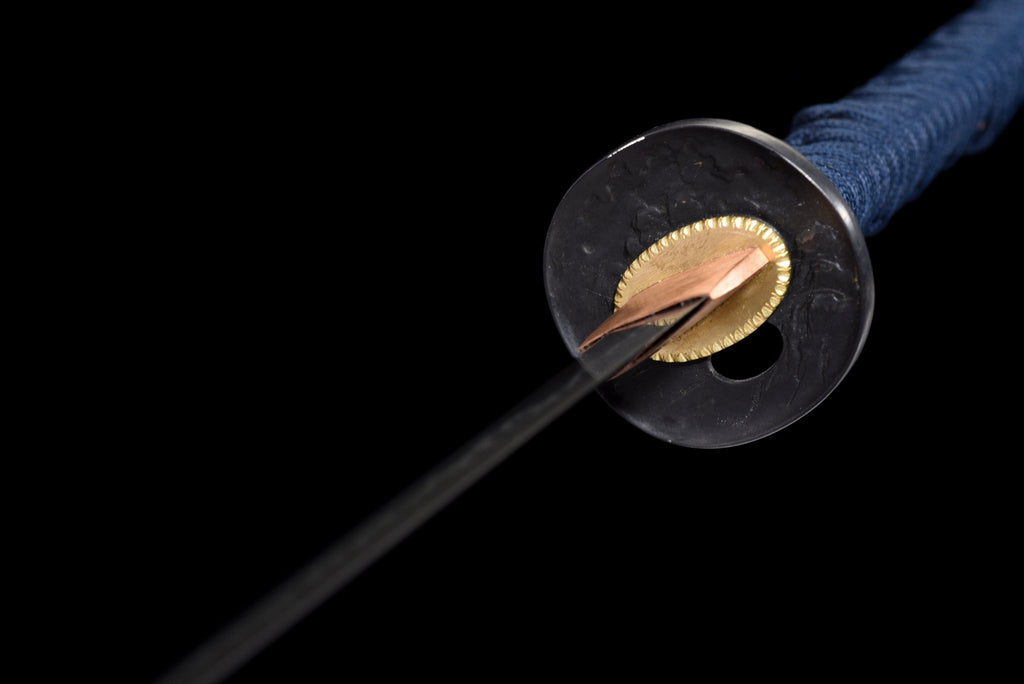 The mounting includes a round steel tsuba depicting a Chinese-style lion descending a mountain, finished in deep black patina. The fuchi and kashira carry matching lion carvings, harmonizing strength and artistry. The tsuka is wrapped in blue cotton ito over genuine rayskin with hishigami underlay, forming a precise diamond pattern for grip and comfort. The saya features a shimmering red lacquer that reflects light beautifully, while the koiguchi, kojiri, and kurigata are reinforced with water buffalo horn for durability. A tightly woven blue cotton sageo completes the mounting, giving the katana an elegant and cohesive appearance.