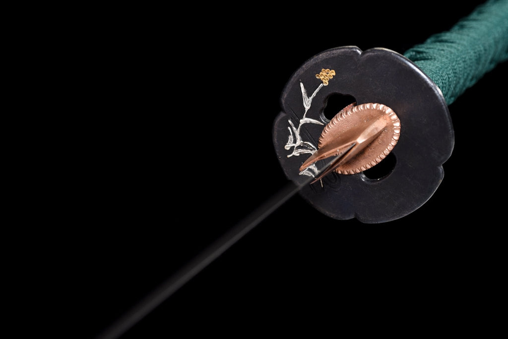 The mountings feature a mokko-shaped copper tsuba finished in a deep black patina, intricately decorated with crane and floral motifs, symbolizing longevity and harmony. The fuchi and kashira are blackened copper with botanical engravings, adding refinement, while menuki with crane and leaf designs lie beneath the wrap for subtle ornamentation.