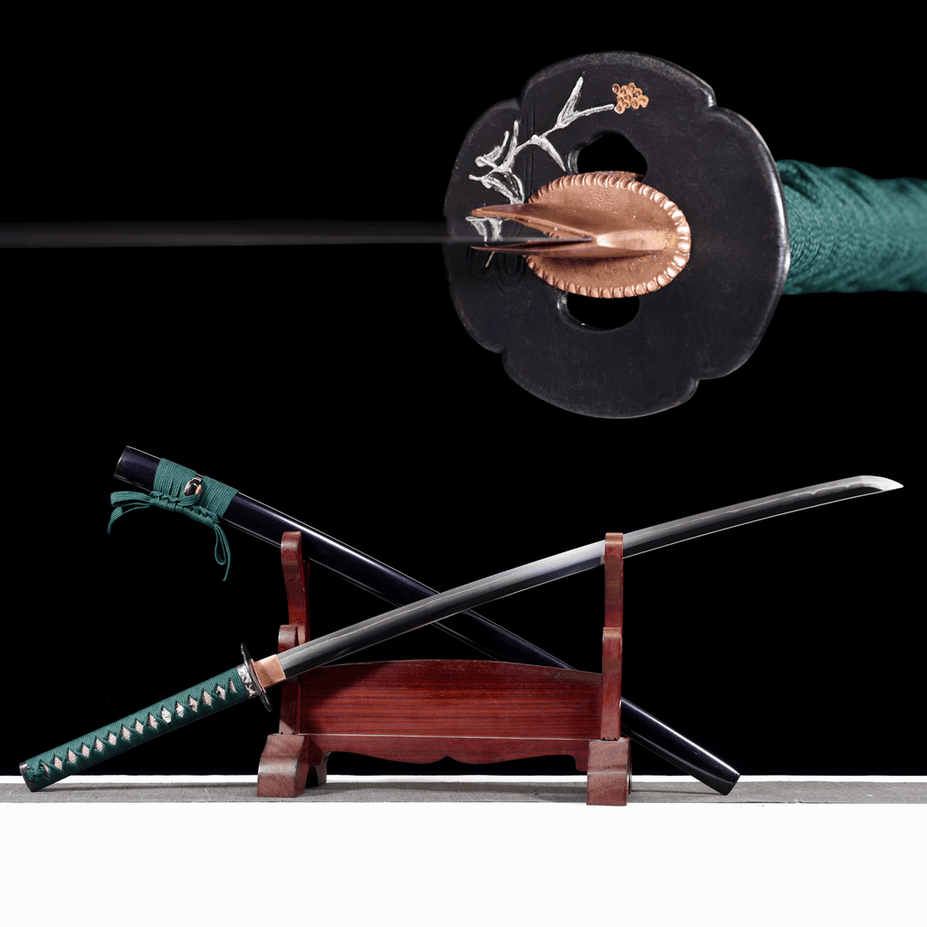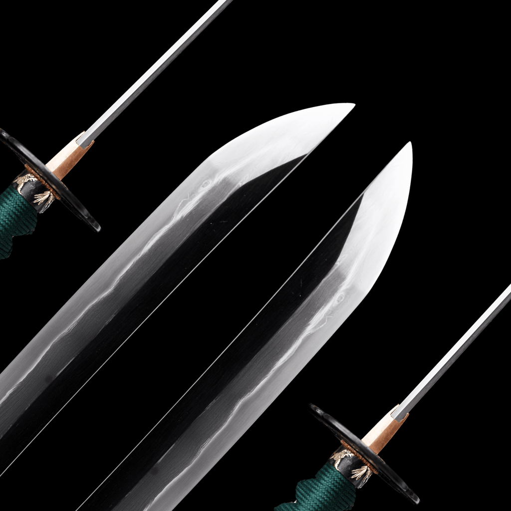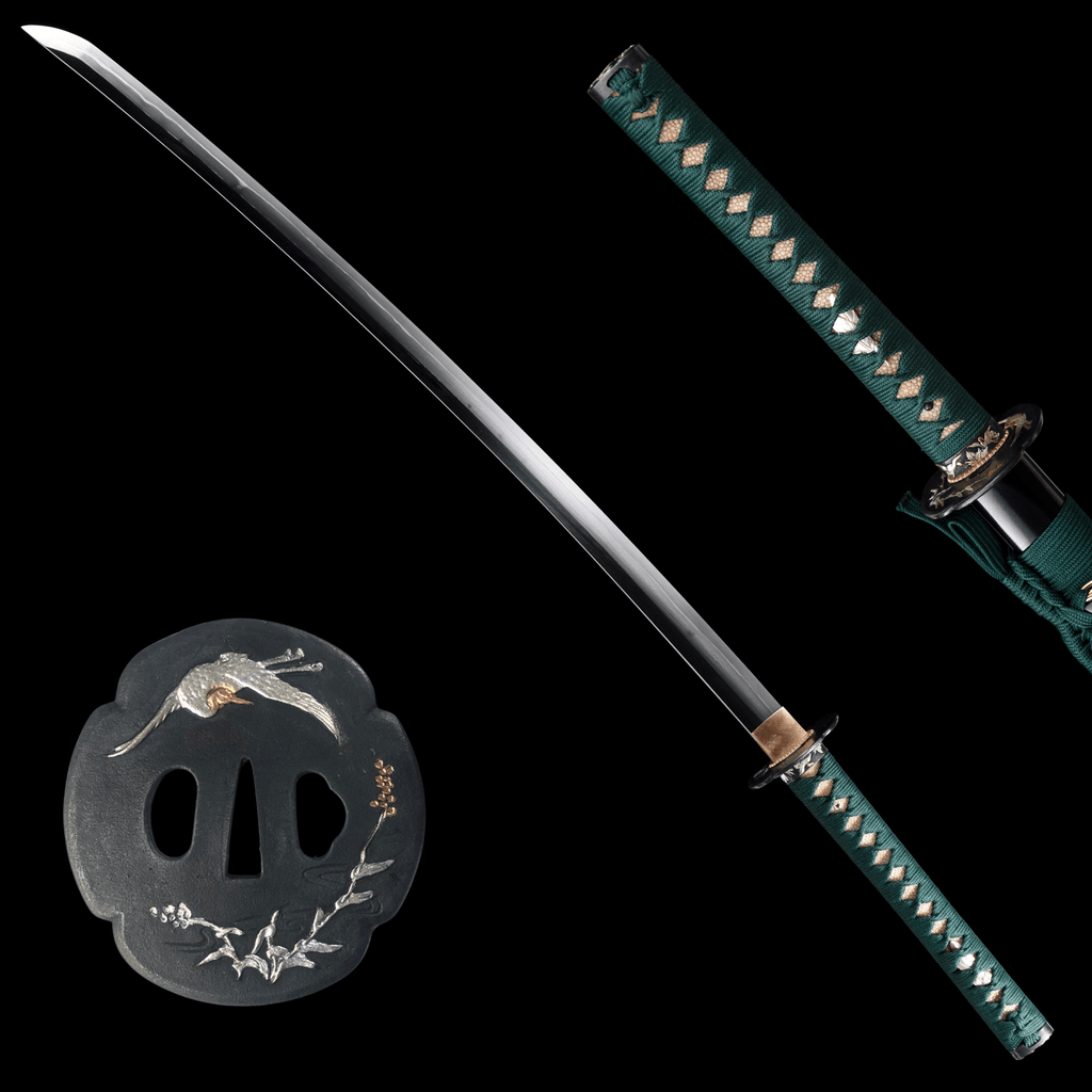This Crane's Grace katana is forged in sanmai construction, with a hardened steel core flanked by softer outer layers, achieving both sharpness and resilience. The blade reveals a straight grain pattern with a flowing notare-komidare hamon, beautifully formed through traditional clay tempering. Forged in the shinogi-zukuri style with a ridged spine and extended tip, it reflects both elegance and strength.