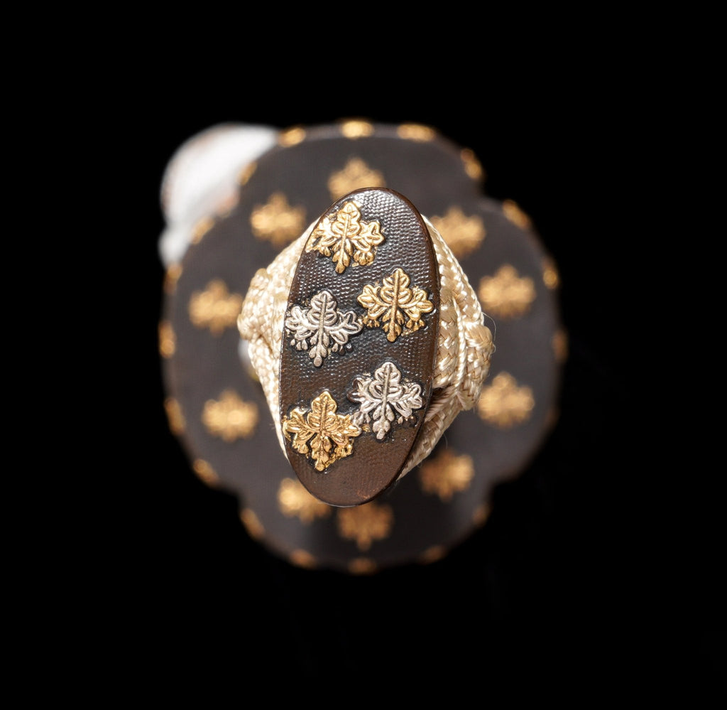 The mountings highlight a noble theme inspired by family crests. A copper mokko-gata tsuba together with the fuchi-kashira are adorned with engraved gilt kamon motifs, radiating refinement and prestige. The koiguchi (scabbard mouth), kojiri (end cap), and kurigata (knob for sageo cord) are crafted from buffalo horn, ensuring both strength and artistry. The tsuka is wrapped in ivory-white cotton ito over genuine rayskin, reinforced with hishigami inserts to form an elegant diamond pattern that balances aesthetics with a secure grip.