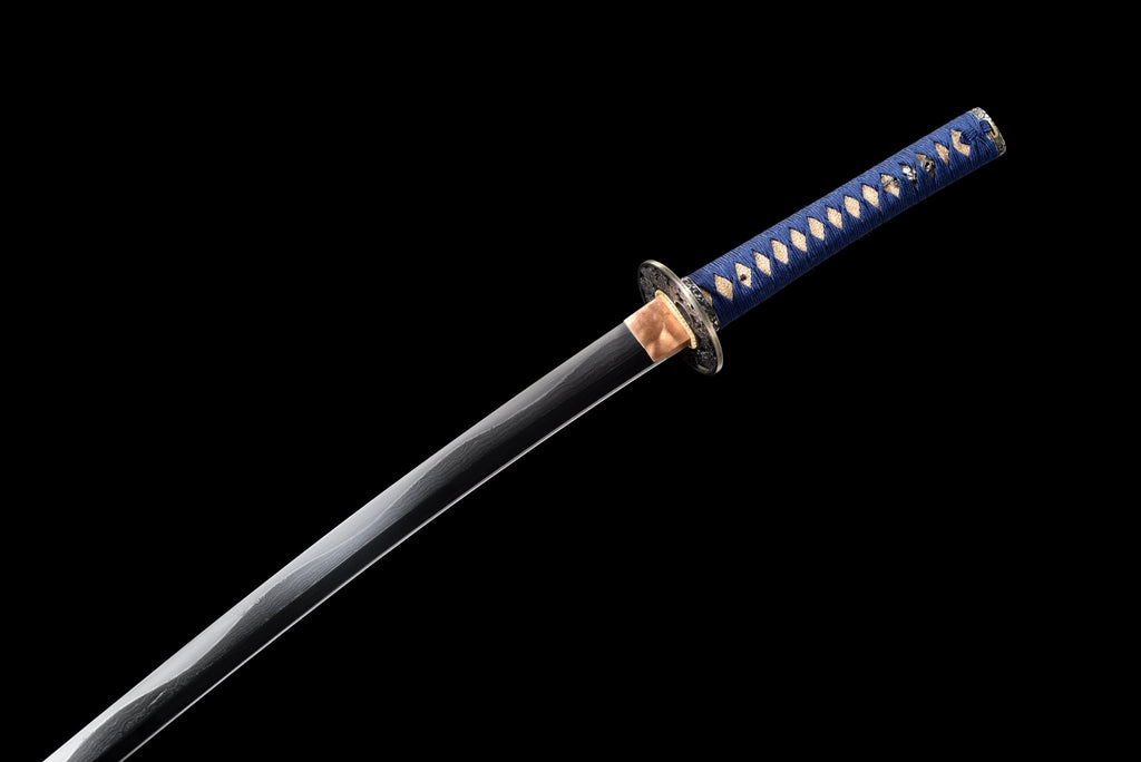 The saya dazzles in black raden-style lacquer, inlaid with shimmering shell fragments that catch the light beautifully, and is reinforced with polished buffalo horn fittings at the koiguchi, kurigata, and kojiri. A navy blue cotton sageo is tied in a refined traditional style. The tsuka is wrapped in deep blue cotton ito over pristine white ray skin in a striking diamond pattern, perfectly aligned with the matching menuki beneath. The fuchi and kashira are crafted from white copper with a rich blackened patina, delicately carved with sakura motifs. The round tsuba, also blackened white copper, is intricately pierced with an elegant sakura design, harmonizing artistry, tradition, and craftsmanship.