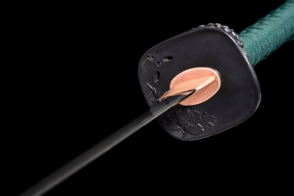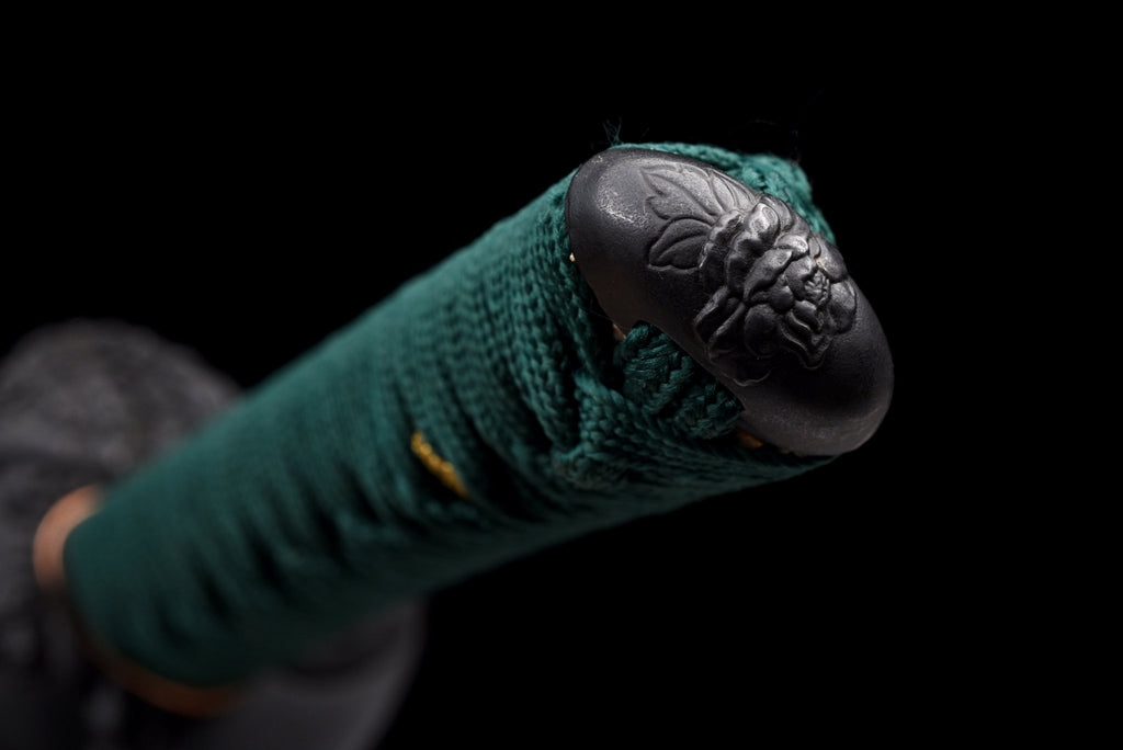The mounting includes a square steel tsuba decorated with a Chinese-style lion and peony motif, finished in a deep black patina. The matching fuchi and kashira carry complementary peony carvings, blending strength with elegance. The tsuka is wrapped in green cotton ito over genuine rayskin with hishigami underlay, forming a precise diamond pattern for comfort and grip. The saya features a red lacquer with black speckles, creating a striking rain-dot texture, while the koiguchi, kojiri, and kurigata are reinforced with water buffalo horn for durability. A tightly woven green cotton sageo completes the mounting, combining refinement with functionality.