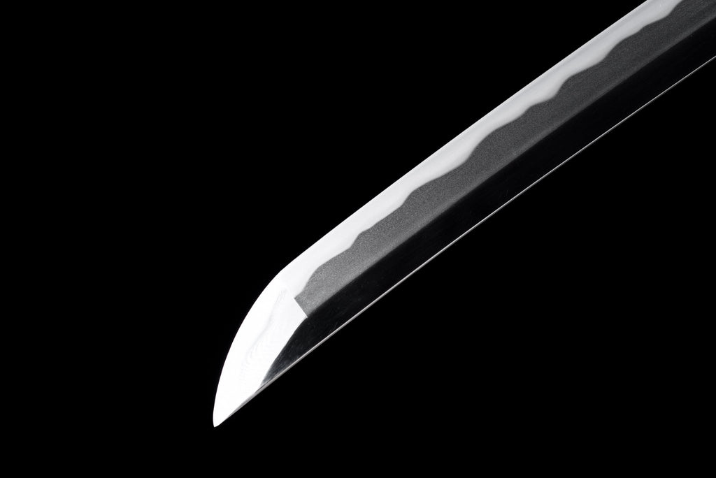 This Verdant Lion katana is hand-forged in Maru-zukuri style from folded high-carbon steel, featuring a refined masame grain on the surface. The blade displays a graceful notare hamon, achieved through traditional clay tempering, with balanced shinogi-zukuri geometry, an elegant iori-mune spine, and a medium-sized chū-kissaki tip.