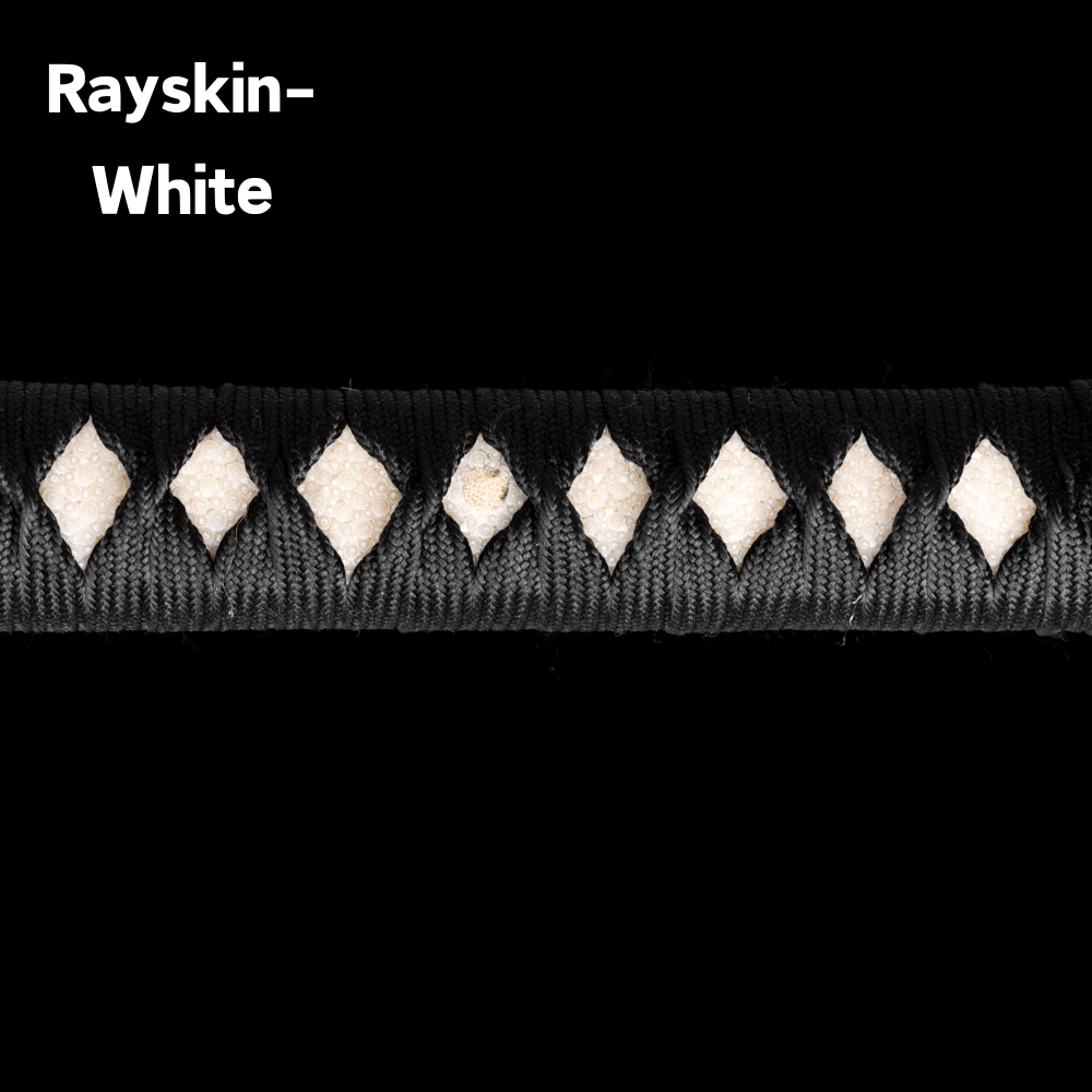 The Tsuka (handle) is crafted from durable hardwood, wrapped with genuine rayskin and high-quality synthetic silk ito for comfort and authenticity. The Saya (scabbard) is made from hardwood and partially wrapped with unpolished genuine rayskin, blending elegance with functionality.