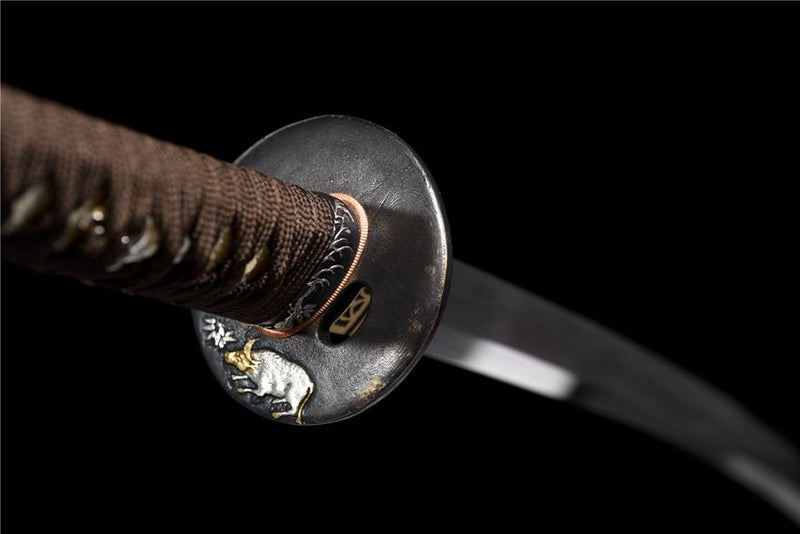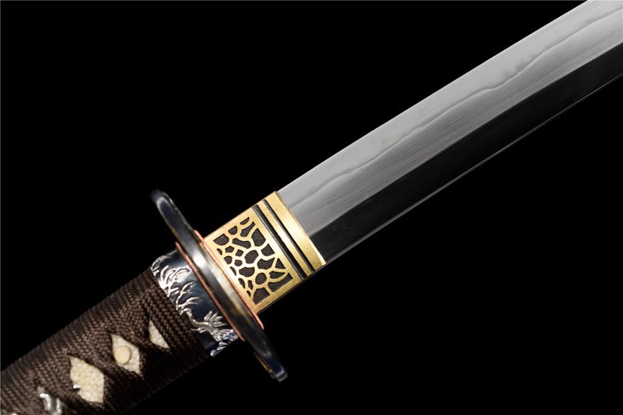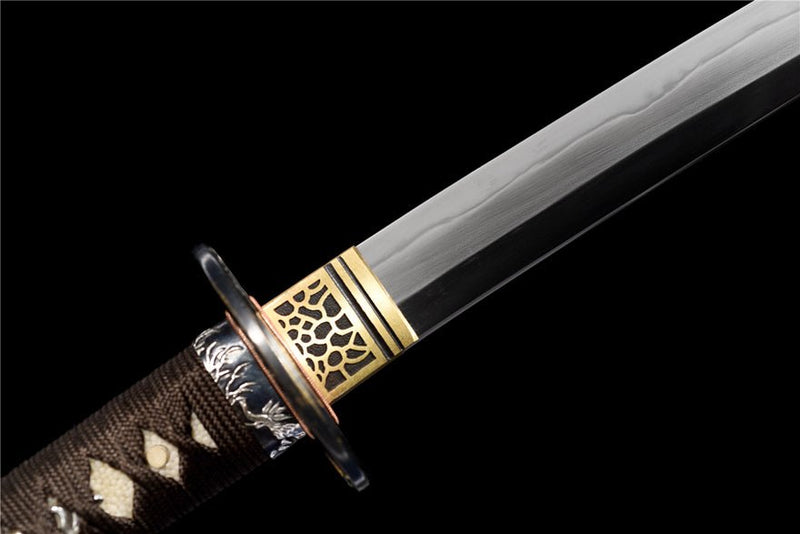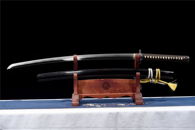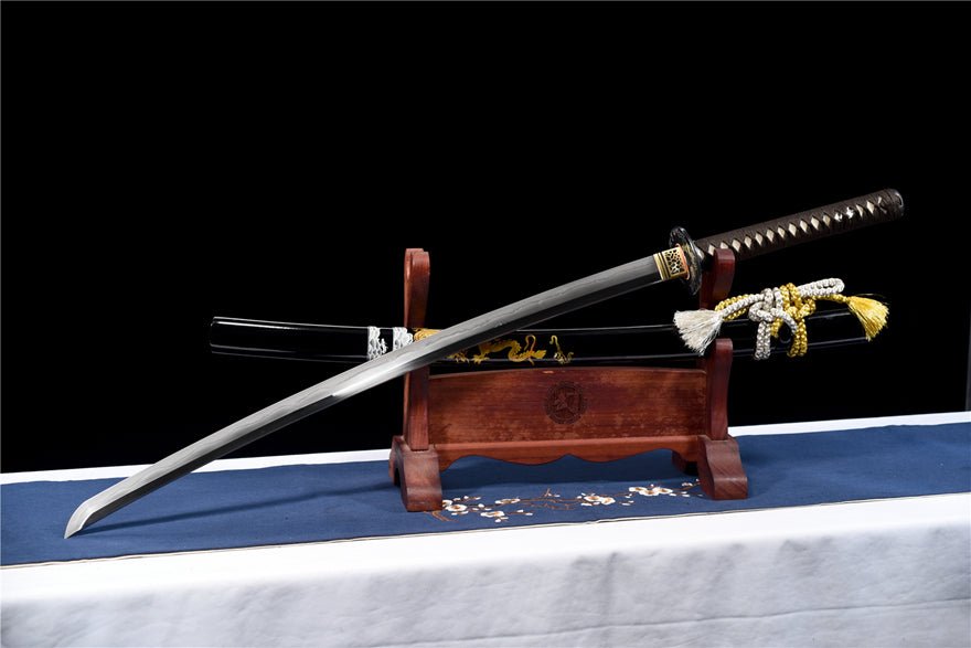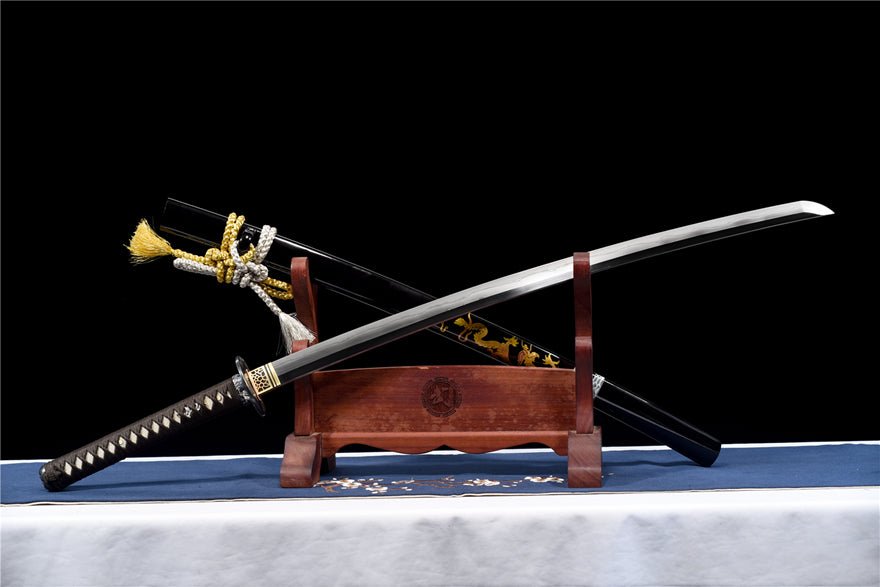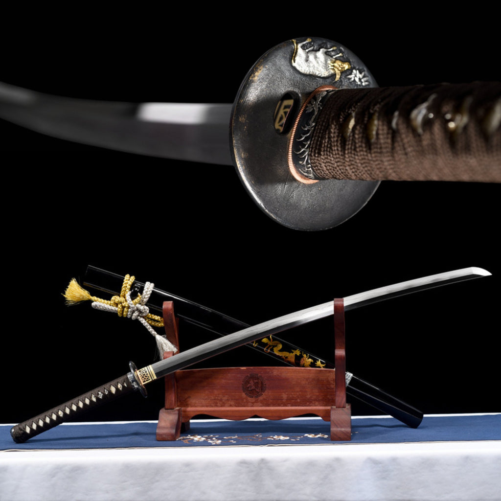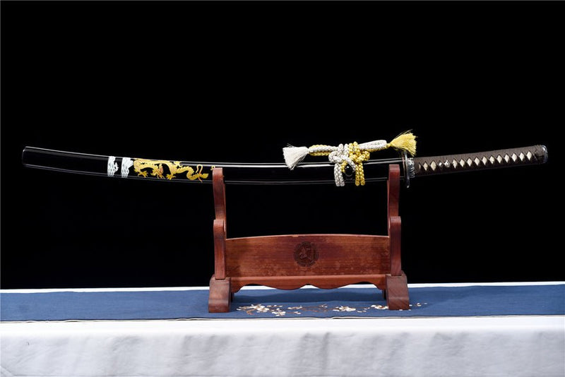 The handmade full-function Katana Sword is 103 cm in length. The Full Tang blade is T10 Clay Tempered Steel, with Hardwood Saya and Brass with Gold & Silver Gilding Fittings. Our swordsmith carefully polished and sharpened the blade, making it not just a beautiful displaying gift. Swords holder or stand sold separately.