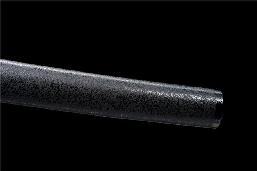 The saya is black, presenting a calm, modern look that feels controlled and focused. A black sageo ties down neatly along the scabbard, while the tsuka is wrapped in black ito, creating a crisp dark grip that balances elegance with intensity.