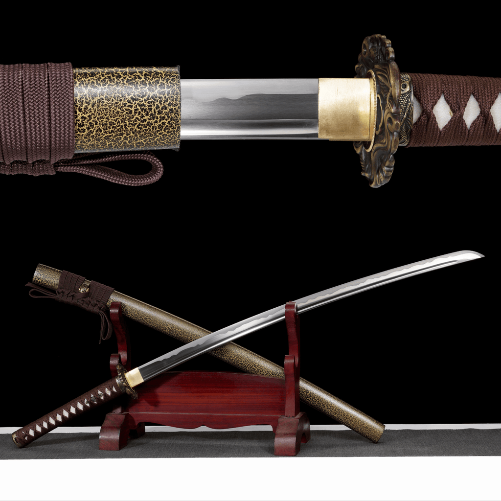 The saya is adorned with a striking black-and-gold crackle lacquer finish, reminiscent of rippling water and shimmering koi scales. Paired with a brown sageo and ito wrapped tightly over genuine rayskin, it provides both aesthetic harmony and a secure, reliable grip. A brass kojiri completes the elegant koshirae, adding a warm metallic accent.