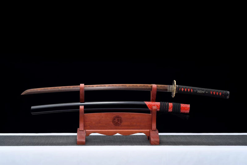 This exquisite Katana Lianyu Damascus Steel Clay Tempered Dark Red Blade is the perfect addition to any sword collection. Handcrafted with high quality Damascus steel, it is clay tempered for greater durability, strength and exquisite detail in the grain. Its classic dark red blade is a testament to the Katana's excellence and artistry.