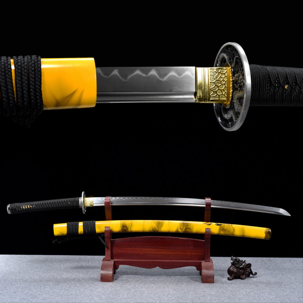 Katana Lingshou | Full Tang T10 Clay Tempered Steel Blade | Polished Edge | Yellow Lacquered Saya
