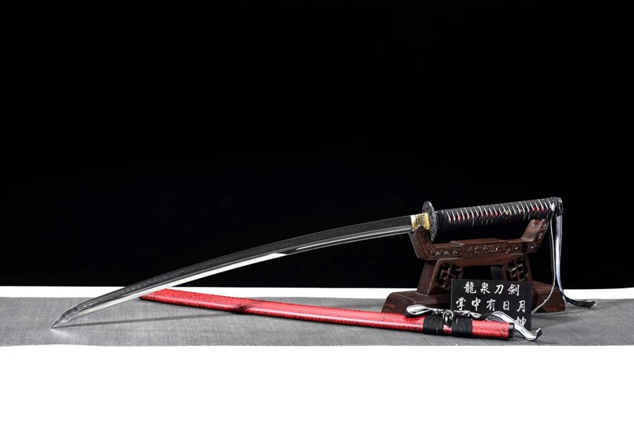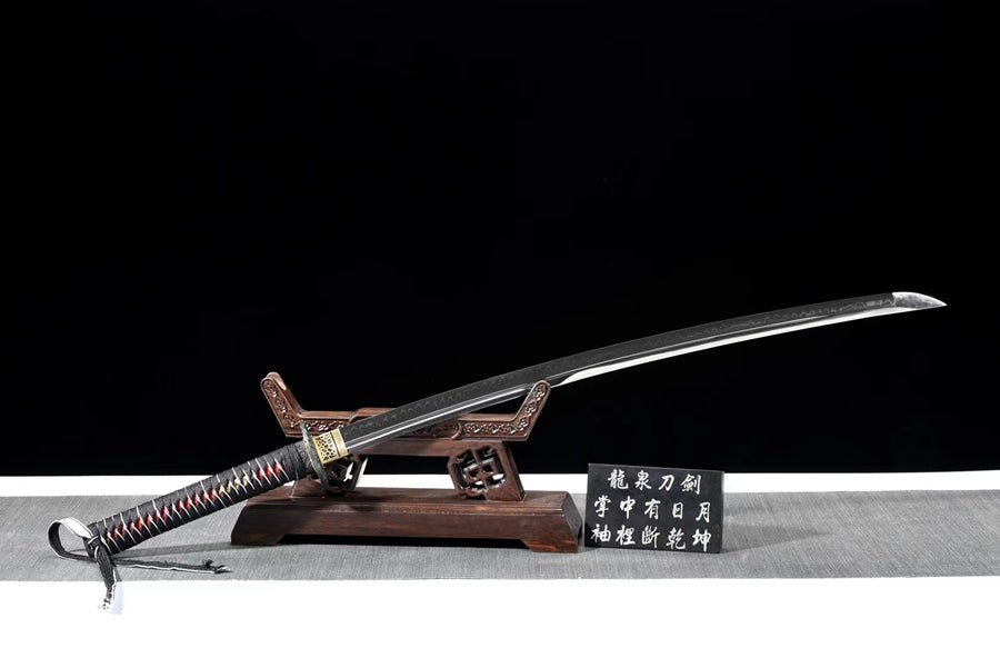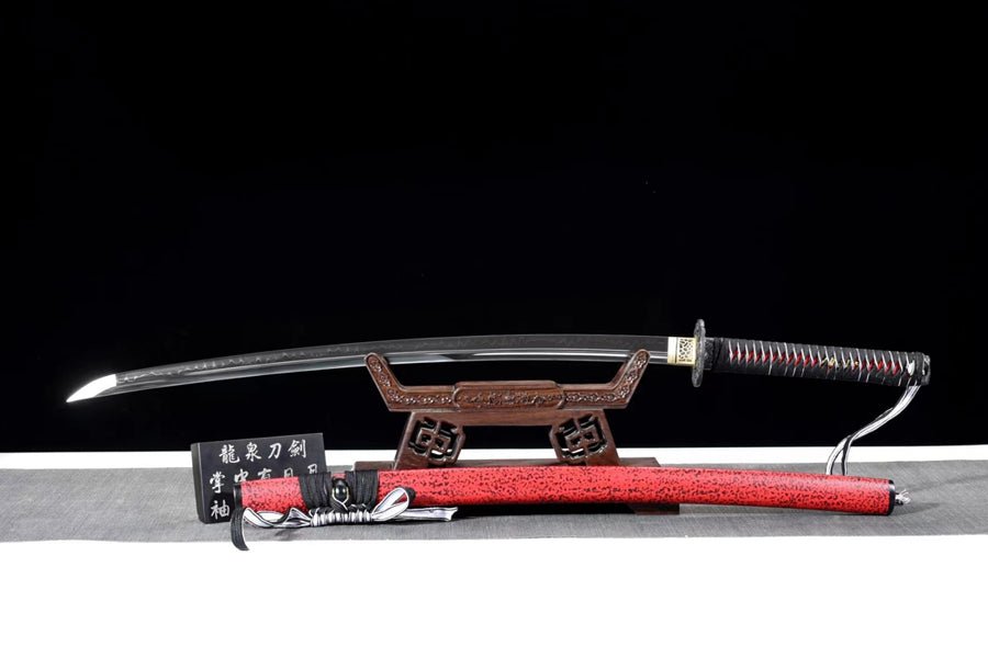 The handmade full-function Katana Sword is 103 cm in length. The Full Tang blade is made of T10 Clay Tempered Steel, with Hardwood Saya and Alloy Fittings. The Swordsmith carefully polished and sharpened the blade, making it not just a beautiful displaying gift. Swords holder or stand sold separately.