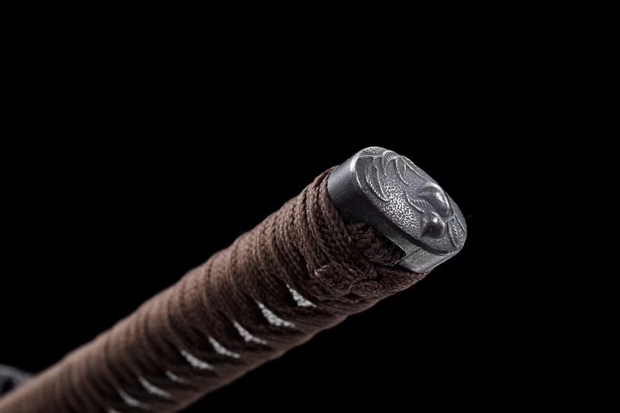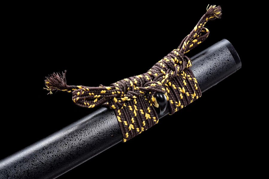 The tsuka is wrapped in brown ito, showcasing the traditional diamond-pattern grip. The saya is black and is paired with a brown and yellow speckled sageo, adding a subtle yet distinctive contrast that enhances the katana’s spirited character.