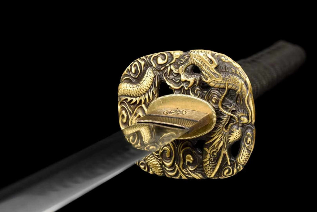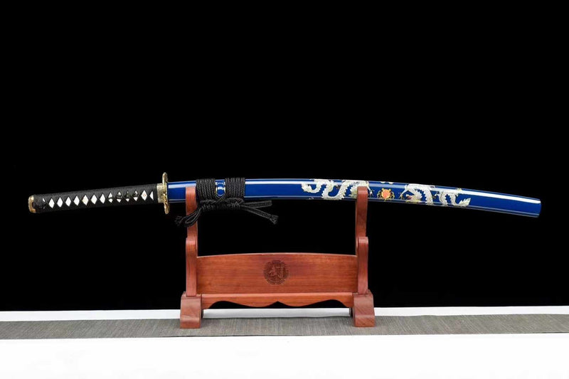 This handcrafted katana features a carbon steel blade with a clay-tempered choji hamon, forged using traditional techniques for exceptional durability and sharpness. The blade undergoes a mirror-polishing process, enhancing its sleek and refined appearance. Measuring 103 cm in total length, it has a 71 cm blade, a 27 cm handle, and a blade width of 3.2 cm. The fittings include a finely carved solid copper tsuba depicting a dragon, adding an element of power and tradition. The katana is paired with a striking blue hardwood scabbard adorned with an intricate dragon motif and complemented by an elegant thick sageo strap. This exquisite piece combines traditional craftsmanship with artistic beauty, making it an excellent addition to any collection.Swords holder or stand sold separately.