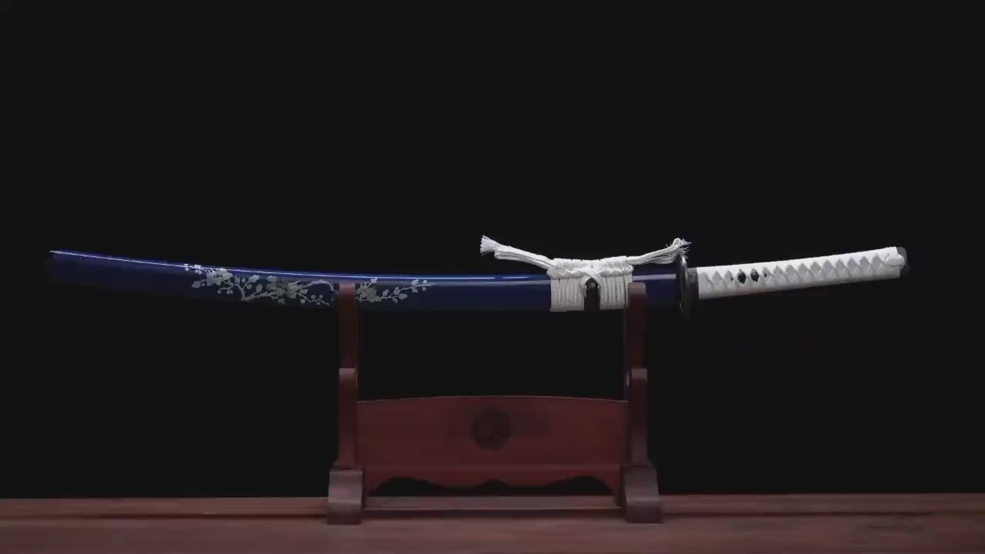 This katana features a high-hardness, highly durable T10 steel blade with a clay-tempered flame-patterned hamon, ensuring each blade has a one-of-a-kind, unrepeatable design. Measuring 103 cm in total length with the scabbard, it has a 71 cm blade, a 26 cm handle, and a blade width of 3.2 cm, with an approximate weight of 1.34 kg. The fittings are made of zinc alloy, while the scabbard is crafted from blue lacquered hardwood adorned with elegant bird-and-flower motifs. The handle is wrapped in white cord, complemented by a matching white sageo strap. This katana is a perfect blend of strength, aesthetics, and traditional craftsmanship, making it a remarkable addition to any collection.Swords holder or stand sold separately.