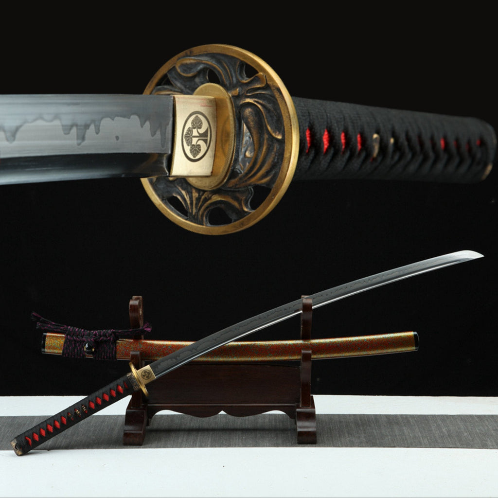 The handmade full-function Katana Sword is 103 cm in length. The Full Tang blade is made of T10 Clay Tempered Steel, with Hardwood Saya and Brass Fittings. The Swordsmith carefully polished and sharpened the blade, making it not just a beautiful displaying gift. Swords holder or stand sold separately.