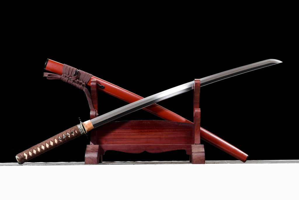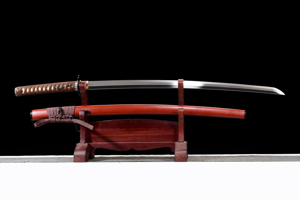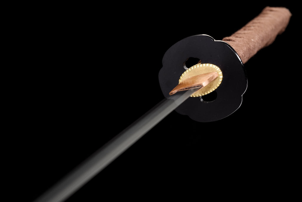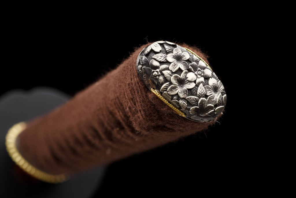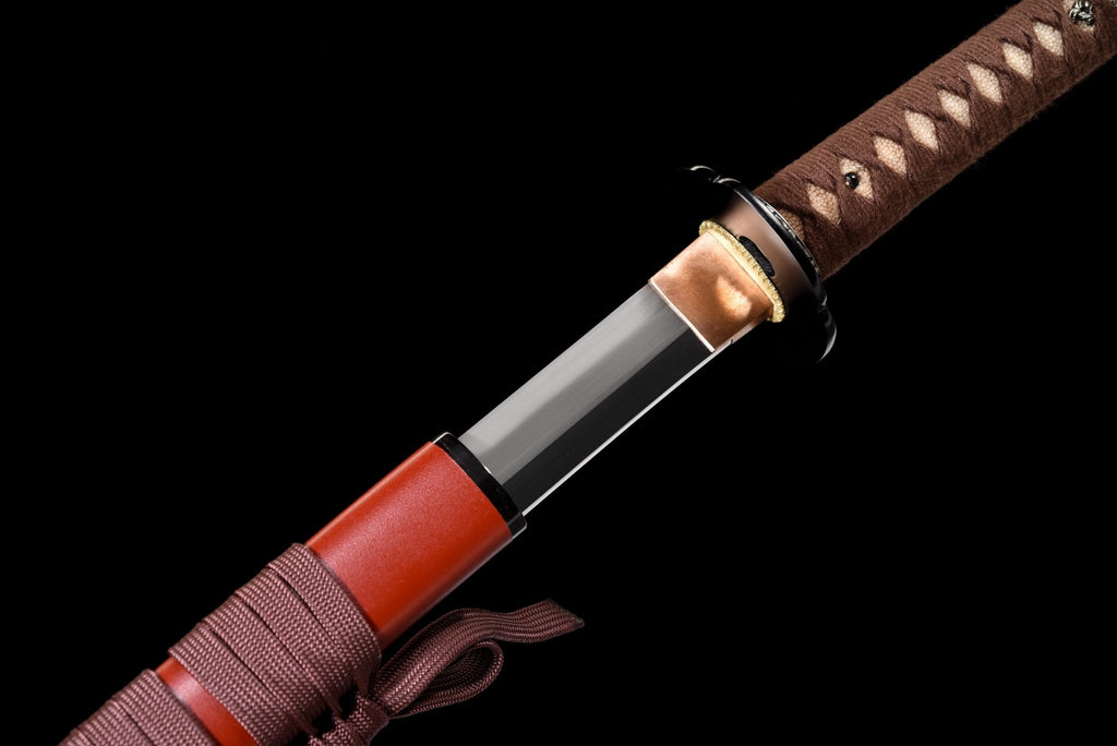 This Red Splendor katana is expertly forged in a Maru-style construction from high-performance modern steel. The blade features a decorative straight-edge (suguha) hamon, polished to highlight its temper line. The Mokko-gata openwork tsuba is crafted from iron with a sleek blackened finish, combining elegance with strength. The fuchi-kashira are made of white copper with delicate floral engravings, blackened and polished for a refined touch. A polished shakudo habaki adds a subtle contrast, while the menuki feature blackened floral designs beneath the wrap.