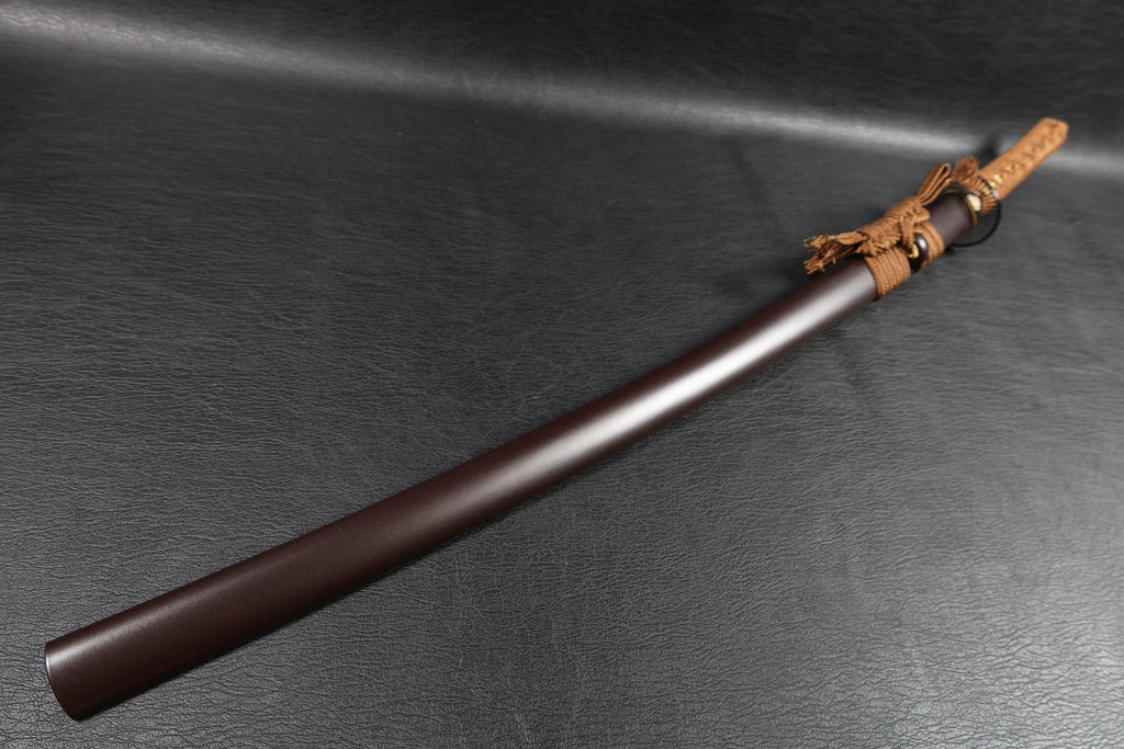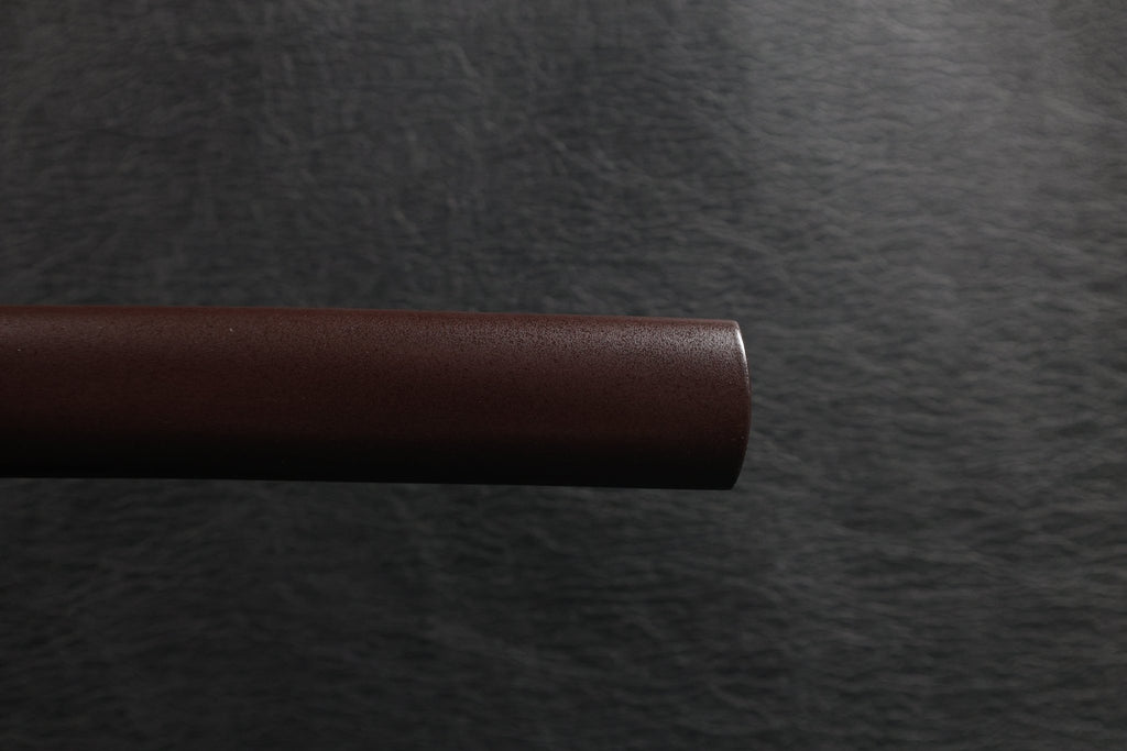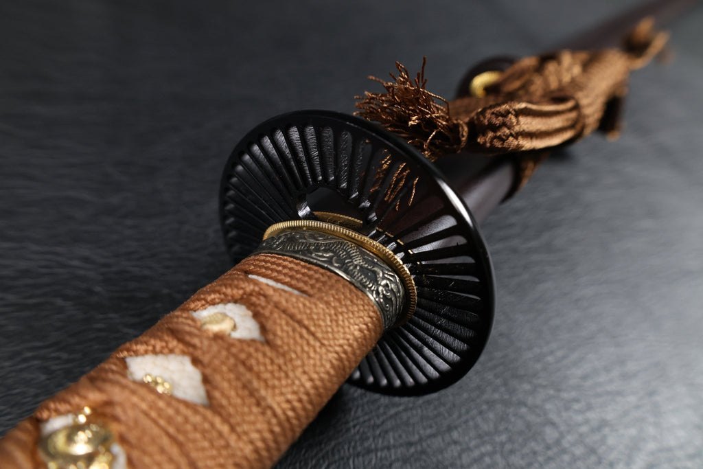 The tsuba features a classic round iron wheel design, enhancing the traditional and robust aesthetic. The Fuchi and Kashira are made of blackened white copper with detailed wave-and-dragon relief, adding a powerful and refined visual presence. The habaki is polished brass. The handle is fitted with white genuine ray skin (samegawa), wrapped with brown tsuka-ito for a firm and comfortable grip. The saya is finished in a brown ishime-style textured lacquer, complementing the overall earthy and grounded tone of the design.