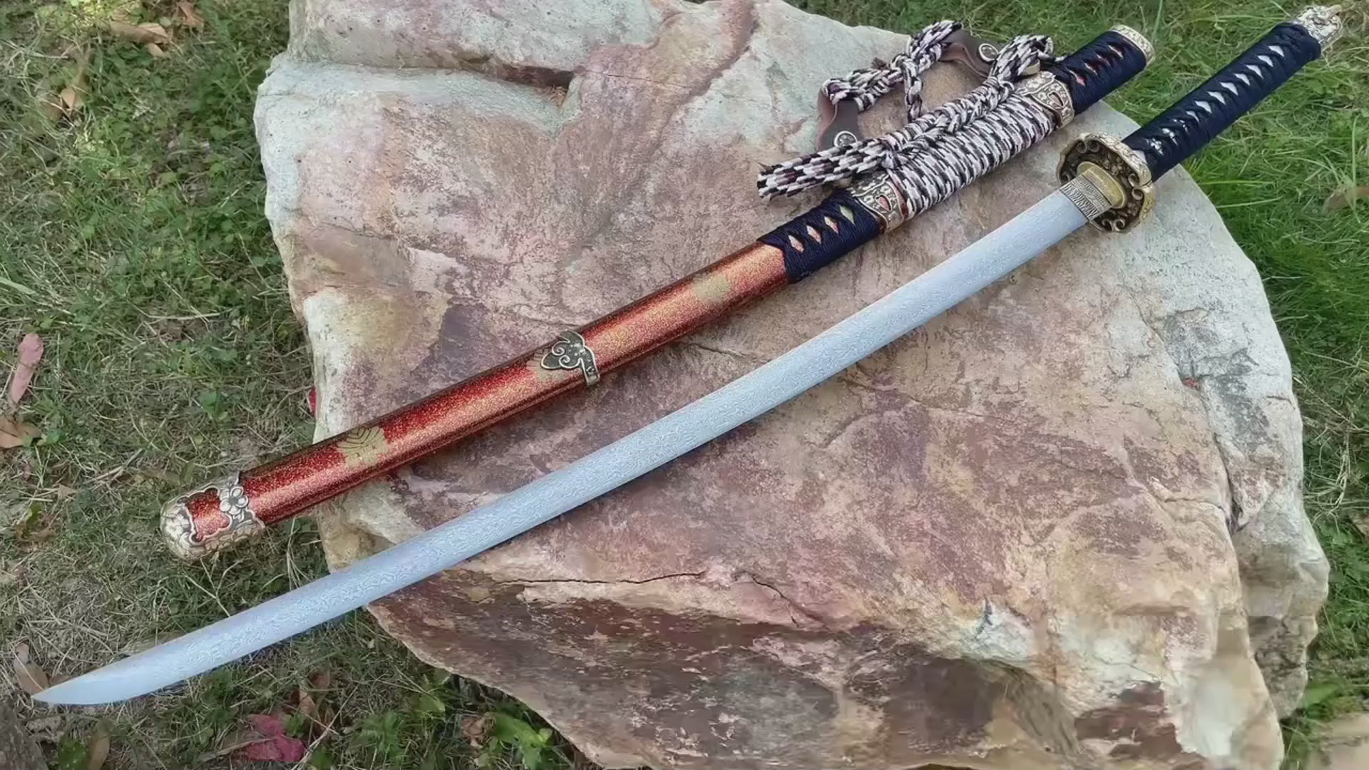 Tachi Sword Fujiwara Damascus Folded Steel Red Saya 藤原