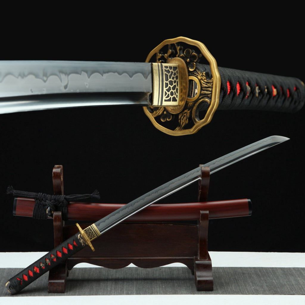 The handmade full-function Wakizashi Sword is 78 cm in length. The Full Tang blade is made of T10 Carbon Steel, with Hardwood Saya and Brass Fittings. The Swordsmith carefully polished and sharpened the blade, making it not just a beautiful displaying gift. Swords holder or stand sold separately.