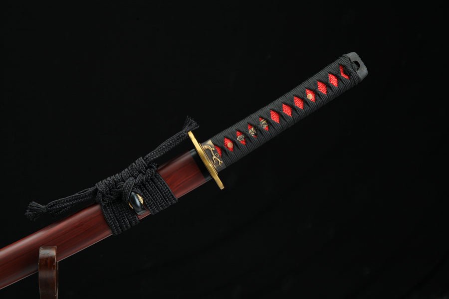This Wakizashi Sword Yanhui T10 is crafted with a clay tempered blade that is sure to impress with its sharpness and durability. This sword features a red saya for added aesthetic appeal. Enjoy the balance and precision of this piece.