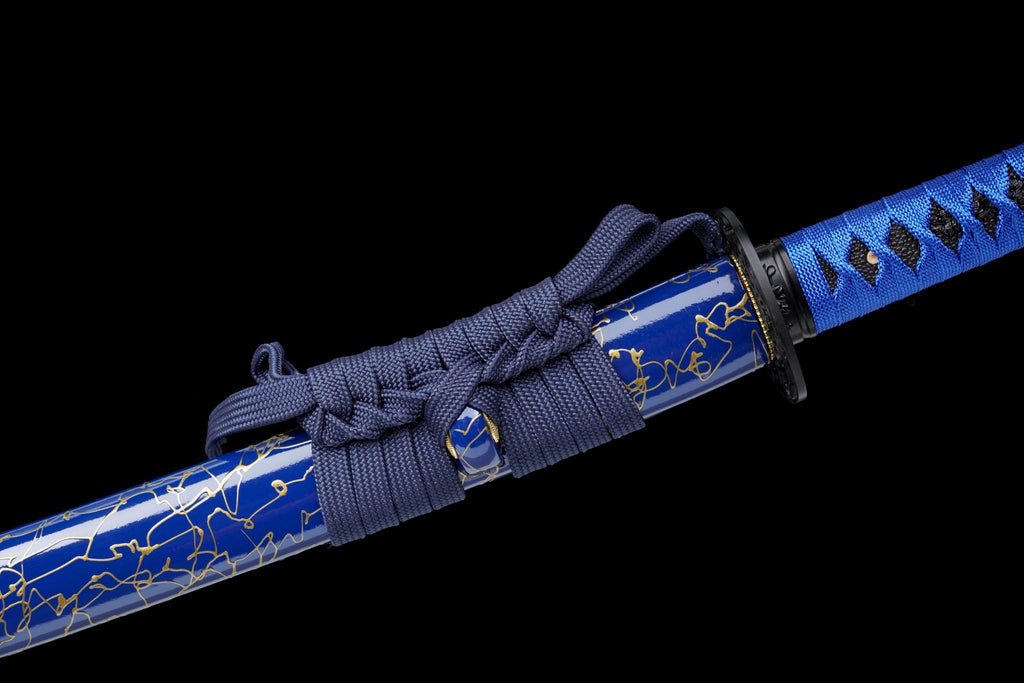 Graceful and fluid, Azure Flowing is a full-tang handcrafted wooden katana that channels the tranquility and movement of flowing water. Its wave-carved tsuba evokes the rhythm of currents, a symbol of adaptability, clarity, and the seamless motion prized in martial arts. The blade is carved from dense hardwood with a single bo-hi groove to enhance balance and deliver the signature “swish” sound in training. Wrapped in deep blue cord over black faux rayskin, the tsuka forms a striking diamond pattern that mirrors the contrast of sky and sea. A copper-toned habaki and engraved fittings add structure and elegance, while the lacquered blue saya gleams with golden wave patterns, invoking the dynamic beauty of water in motion. Whether for Iaido, kata practice, or display, Azure Flowing embodies grace, precision, and the timeless artistry of the sword.