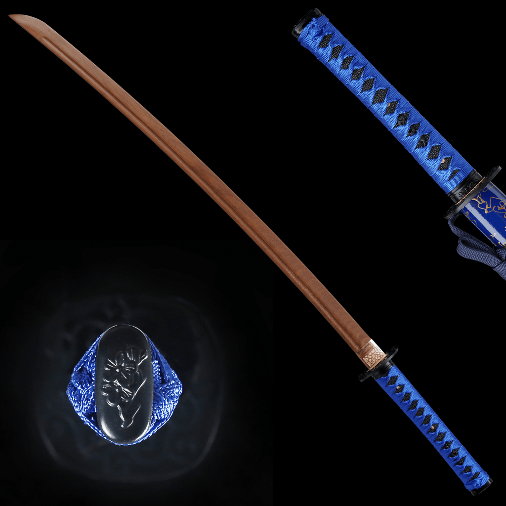 Wooden Katana Azure Flowing With Premium Wood Blade, Unsharpened Japanese Samurai Sword with Blue Saya for Training and Cosplay