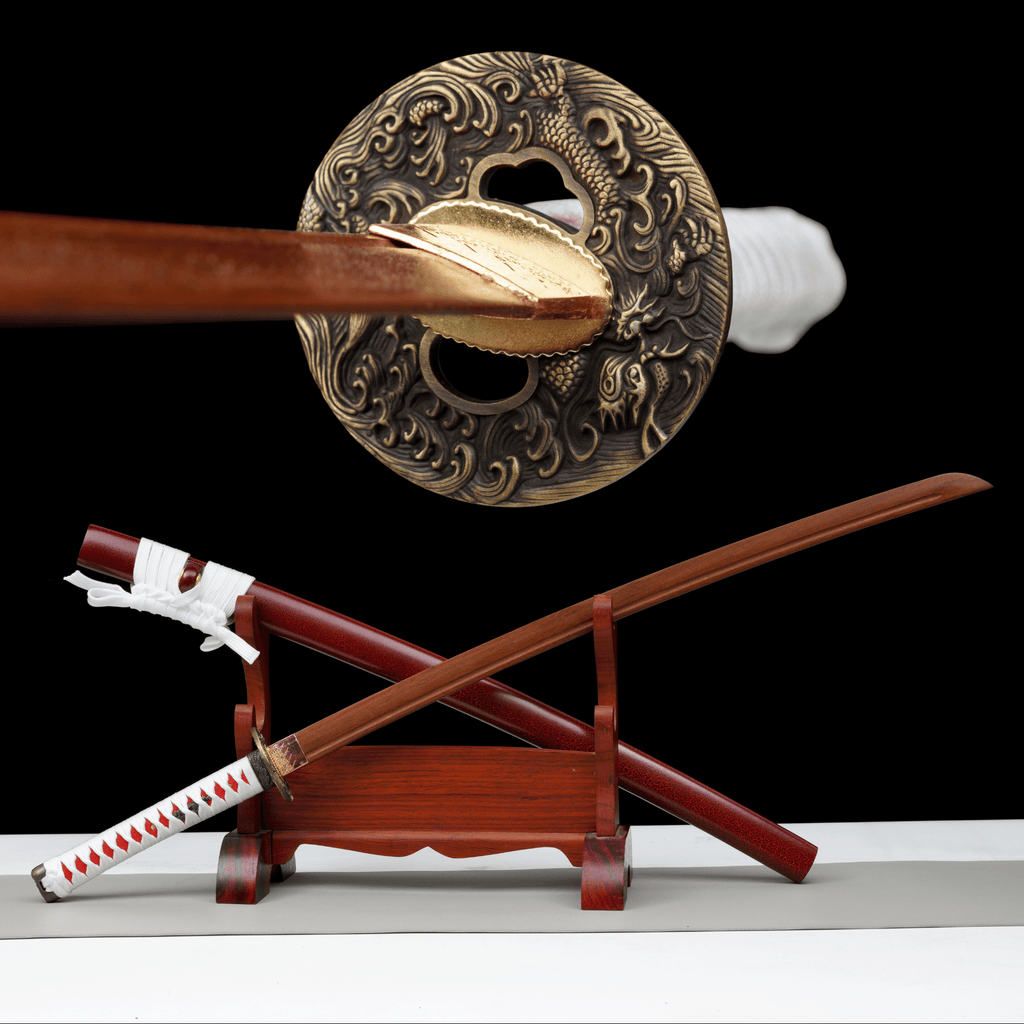 Graceful yet bold, Crimson Spirit is a full-tang handcrafted wooden katana that embodies focused strength and timeless beauty. Its ornate dragon-themed tsuba, cast in antiqued brass, symbolizes power, wisdom, and protection—a tribute to inner mastery.