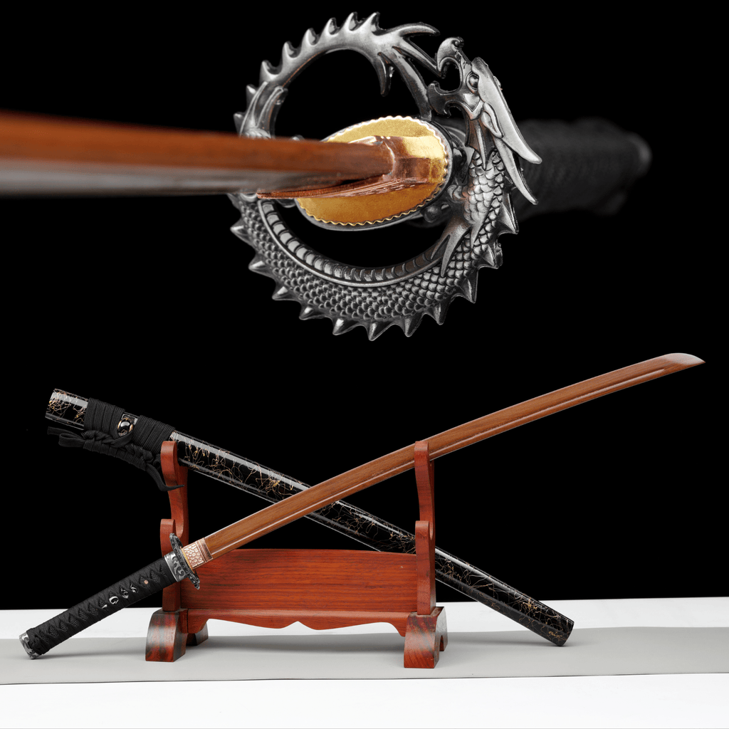 Wooden Katana Dragon Shadow With Premium Wood Blade, Unsharpened Japanese Samurai Sword with Gold Streaked Gloss Black Saya for Training and Cosplay