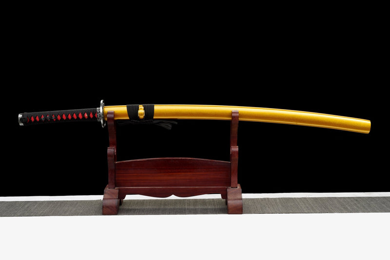 The glossy golden saya, finished with black sageo cord, captures the brilliance of flame and sunlight. This piece is ideal for Iaido, Kendo, or traditional Japanese sword demonstrations—where style meets function.