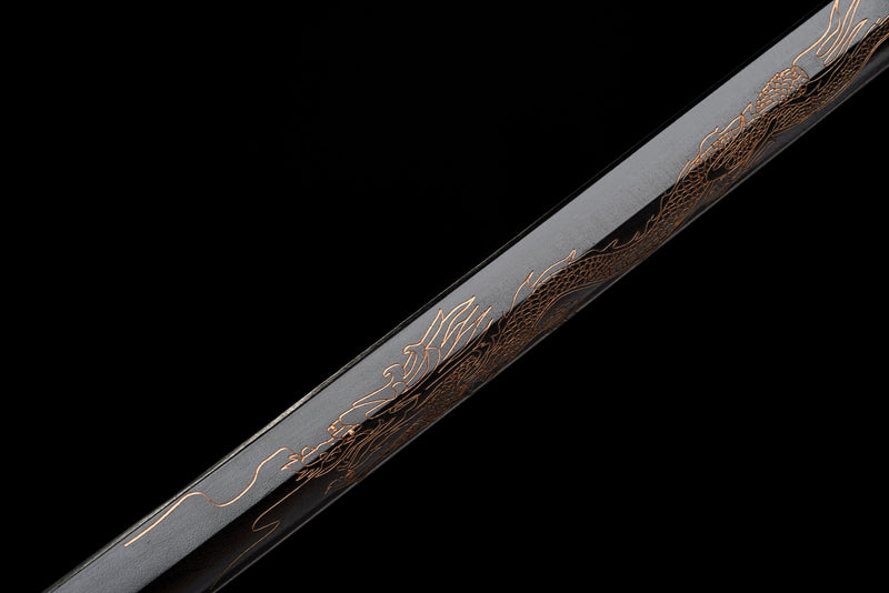 Sleek, powerful, and steeped in symbolism, Xuanlong (“Black Dragon”) is a handcrafted full-tang wooden katana built for serious martial arts training. Made from solid hardwood and finished in black, it features a carved golden dragon along the blade’s side—an homage to strength, discipline, and tradition.
