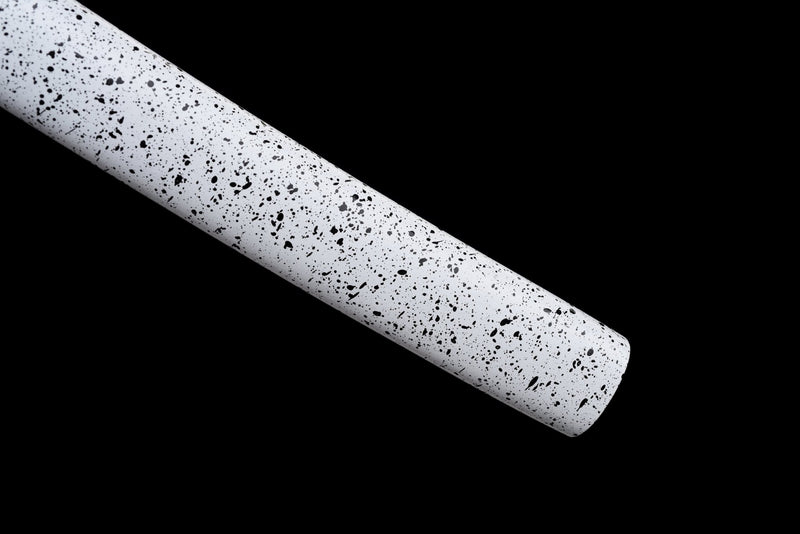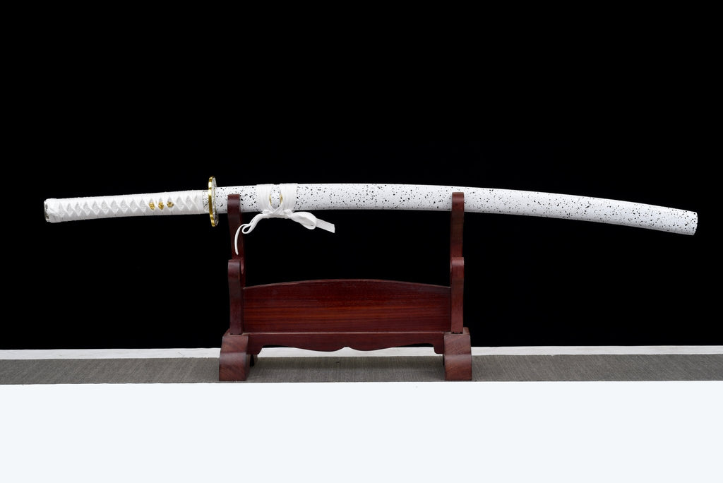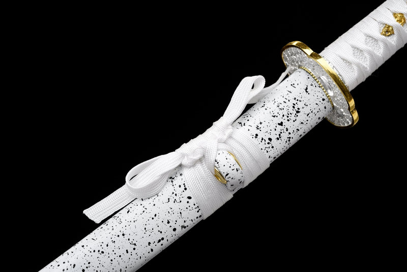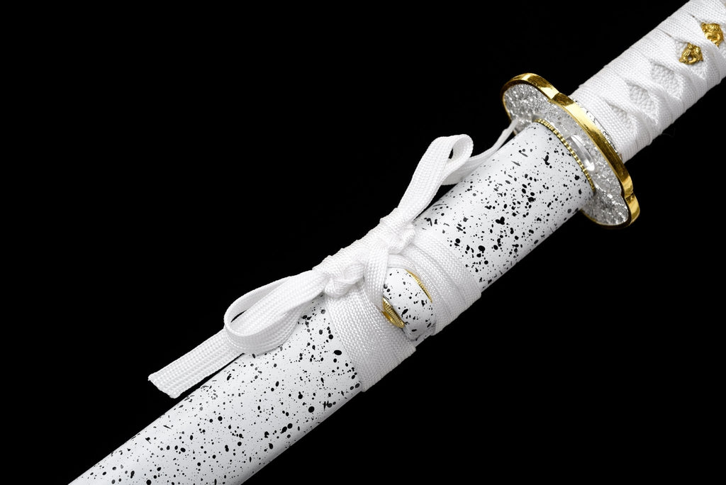 The saya features a white lacquer finish with scattered black speckling—reminiscent of falling snow on inkstone—paired with a pure white sageo, completing a look that is both modern and steeped in classical Japanese aesthetics.