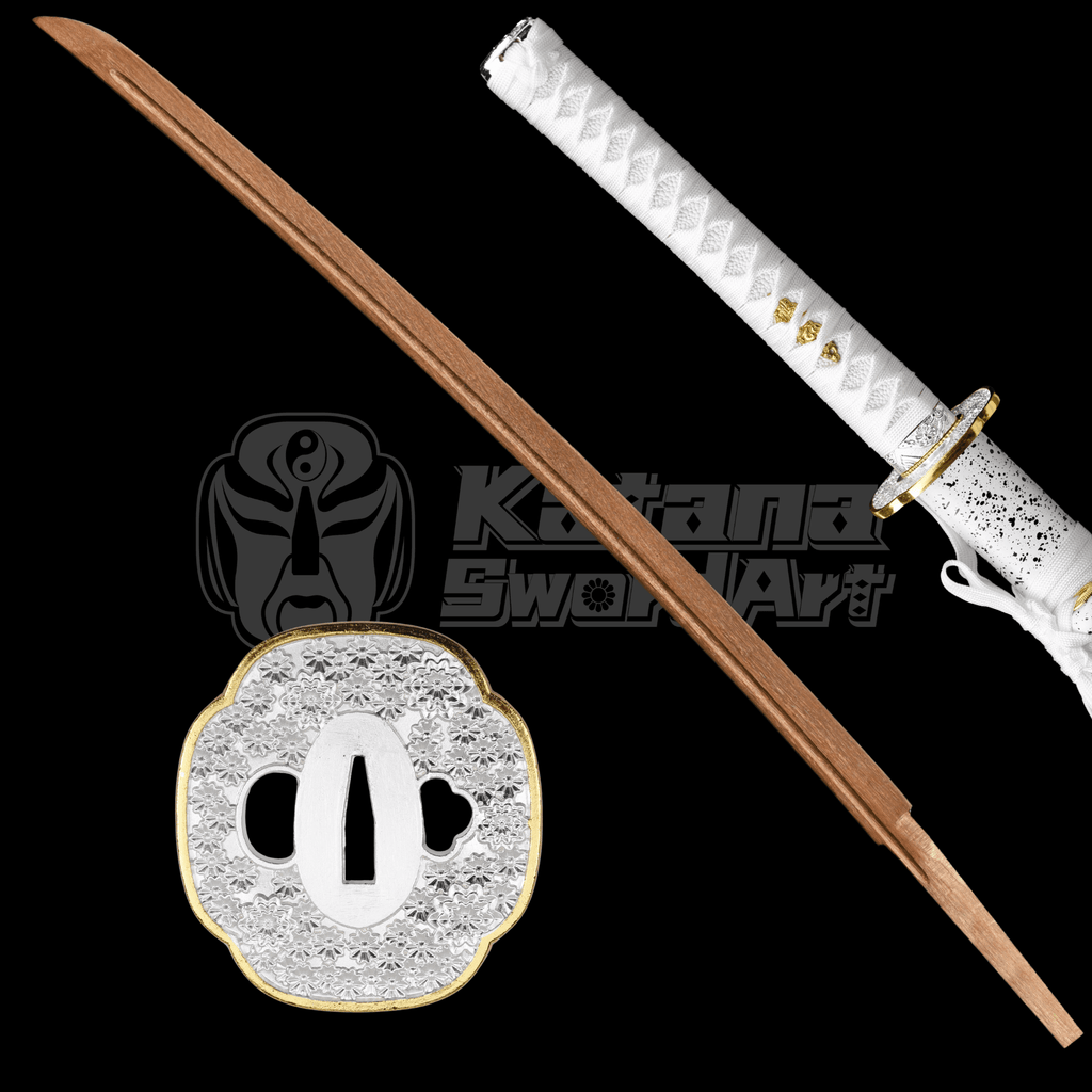 The blade is carved from smooth hardwood with natural grain, shaped to replicate the gentle curvature of a real katana. The handle is wrapped in crisp white cord and fitted with silver end caps engraved with delicate floral motifs. Golden menuki and a silver-plated tsuba with intricate flower patterns framed in gold create a refined contrast, evoking the quiet bloom of frost-covered petals.